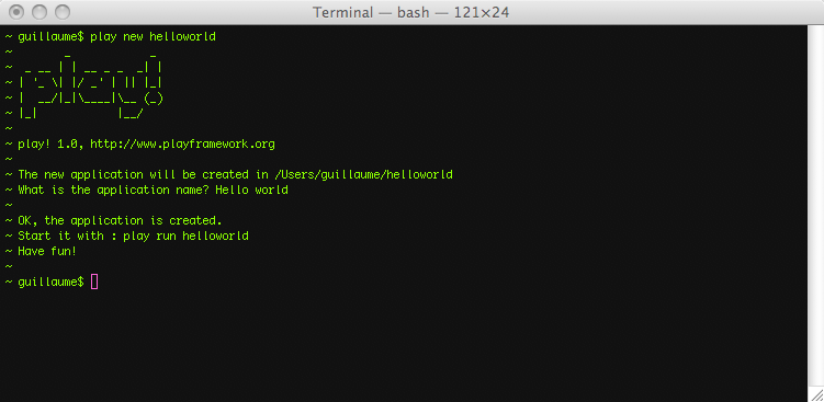 Now that Play is correctly installed, it’s time to create the hello world application. Creating a Play application is pretty easy and fully managed by the Play command line utility. That allows for standard project layouts between all Play applications.