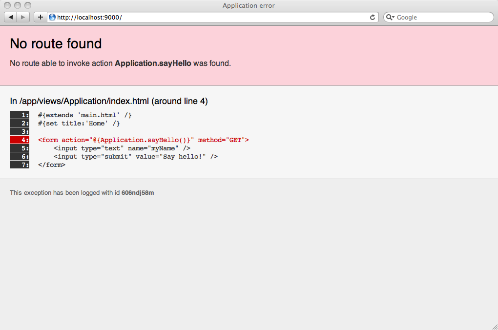 Oops, you get an error. This is because you reference the non-existent action Application.sayHello. Let’s create it in the helloworld/app/controllers/Application.java file: