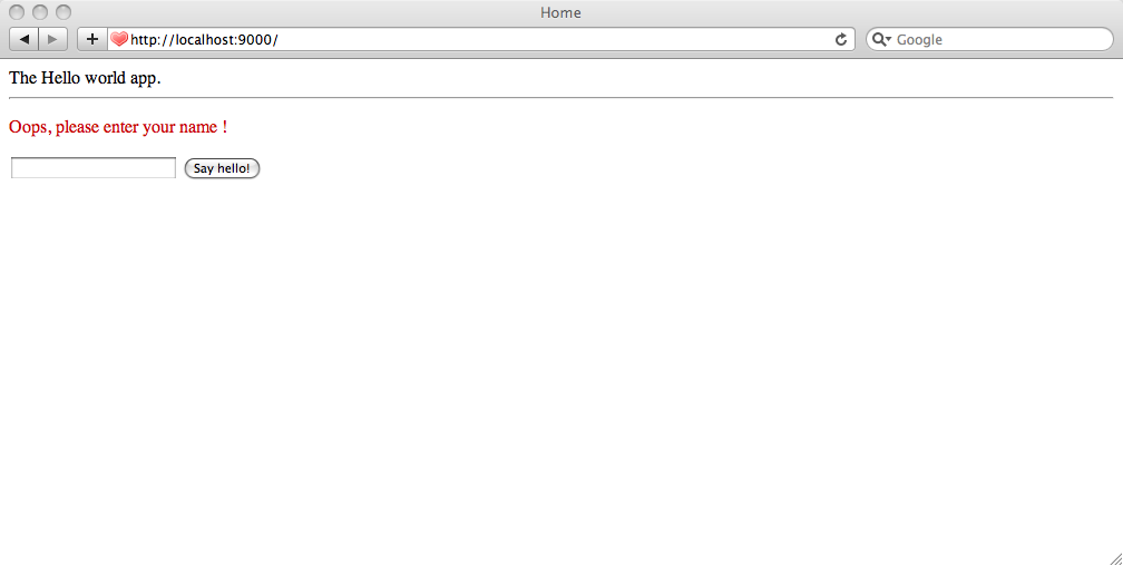 We use the @{…} notation to ask Play to automatically generate the URL able to invoke the Application.sayHello action. Now, refresh the home page in the browser.