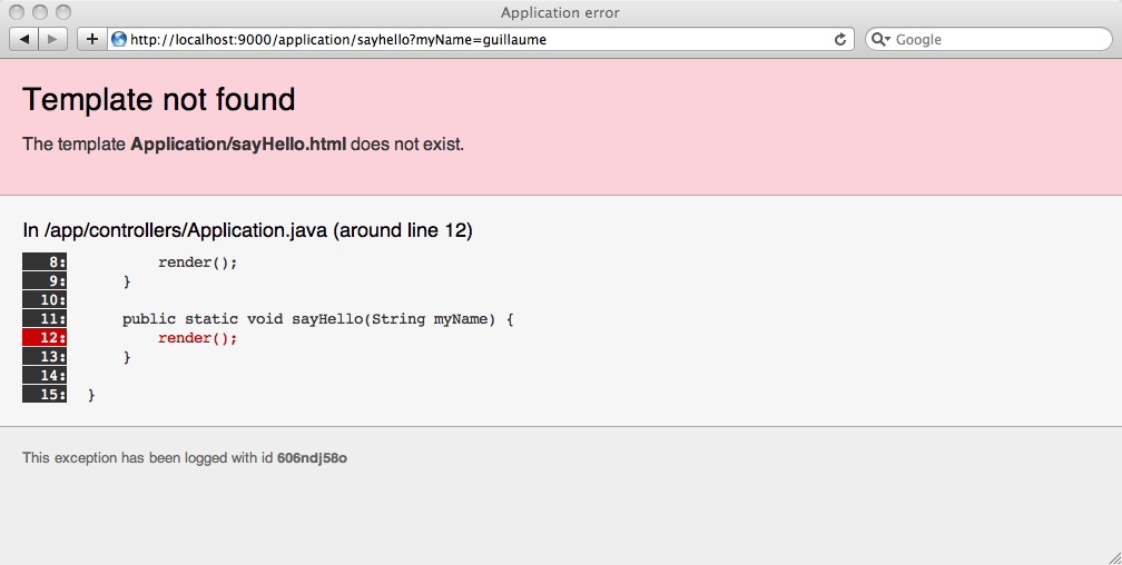 The error is pretty clear. Play tries to render the default template for this action method, but it doesn’t exist. Let’s create it in the file helloworld/app/views/Application/sayHello.html: