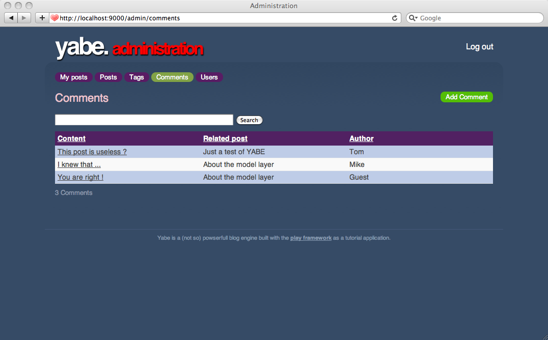 The last thing to make all this new stuff work is to create the yabe/app/views/Admin/index.html template. Let’s start with something simple: