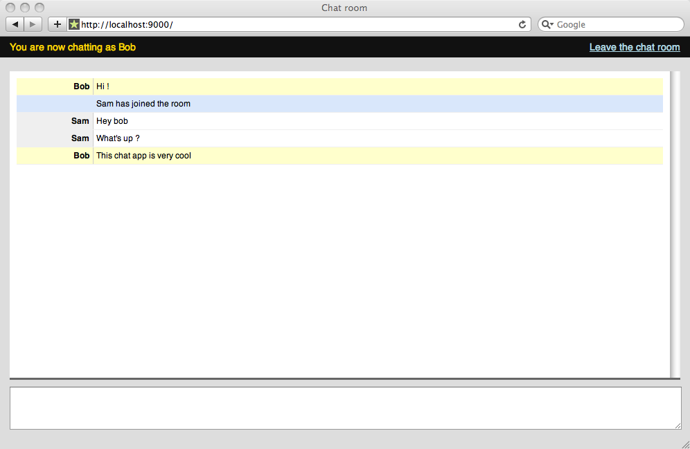 An HTTP-based chat application. It uses the asynchronous request model to be able to handle a lot of simultaneous connected users without wasting resources.