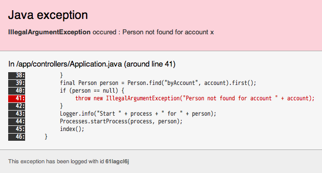 Try to imagine a JSF web application producing a stack trace this short. In fact, Play goes further: instead of showing the stack trace, the web application shows the last line of code within the application that appears in the stack trace. After all, what you really want to know is where things first went wrong in your own code.