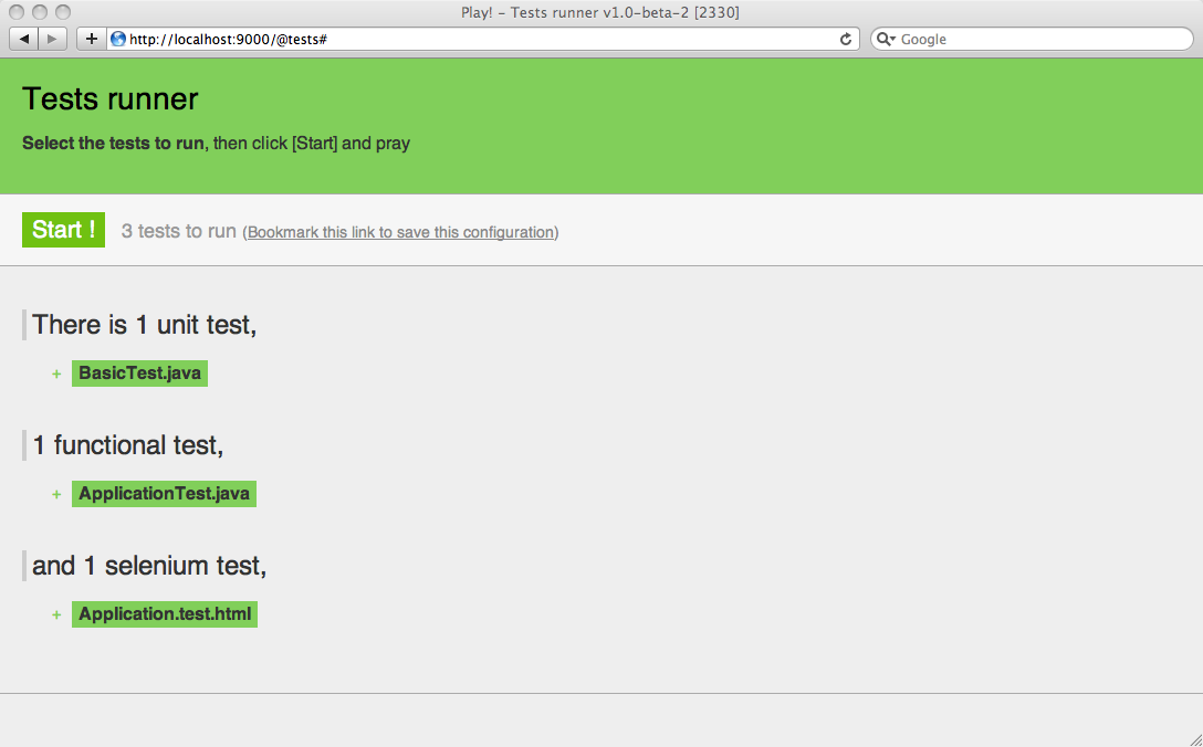 Open a browser to the http://localhost:9000/@tests URL to see the test runner. Try to select all the default tests and run them; all should be green… But these default tests don’t really test anything.