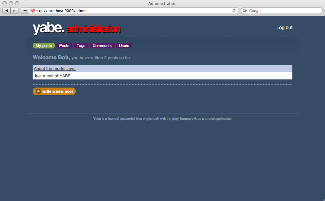 Finally, edit the yabe/app/views/Admin/index.html template to link the Write a new post button to this form: