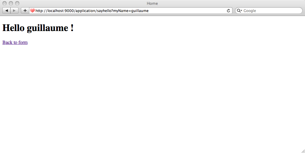 Application.sayHello アクションを起動できる URL を自動的に生成するよう Play に問い合わせるには @{...} 記法を使用します。さあ、ブラウザ内のトップページをリフレッシュしましょう。