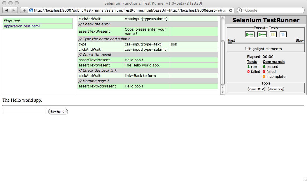 新しく作成された Play アプリケーションのデフォルトのテストスイートには selenium テストが含まれています。 helloworld/test/Application.test.html ファイルを開いてください: