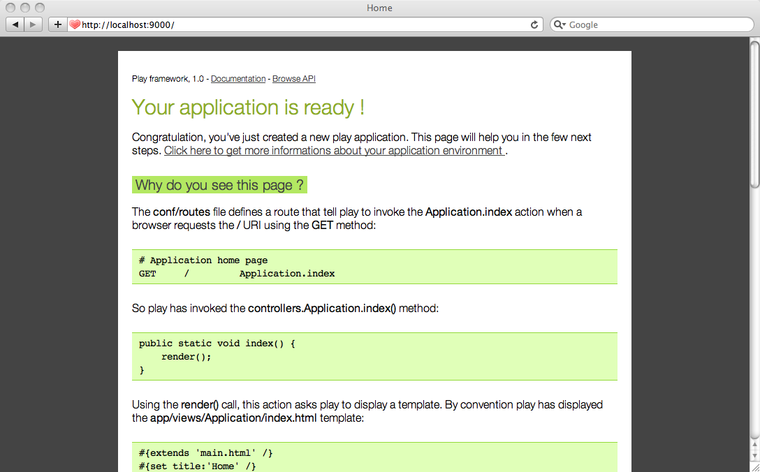 デフォルトの index アクションはシンプルです: Play にテンプレートをレンダリングするよう指示する render() メソッドをコールします。テンプレートの使用は HTTP レスポンスを生成する最も一般的な (しかし、唯一ではない) 方法です。