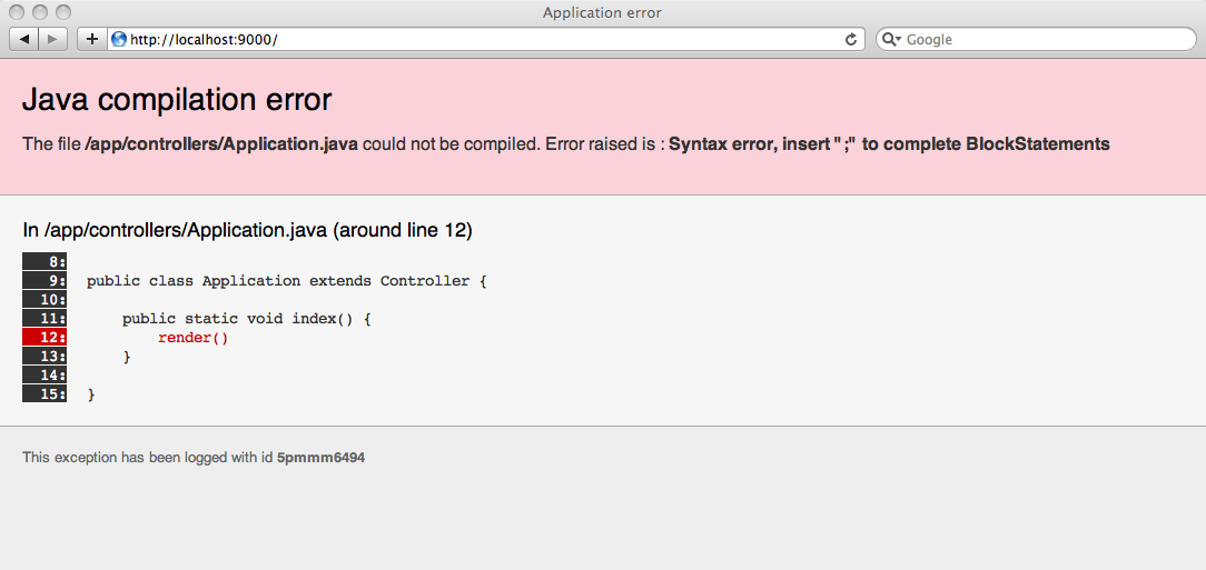 これは、開発工程において 2 つの非常に重要なことを可能にします。最初の 1 つは、Play があなたが Java ソースファイルに加えたいかなる変更をも検出して、実行時にそれを自動的にリロードするということです。 2 番目は、Java の例外が発生したとき、Play がソースコードそのものを示しながらより良いエラーレポートを作成するということです。