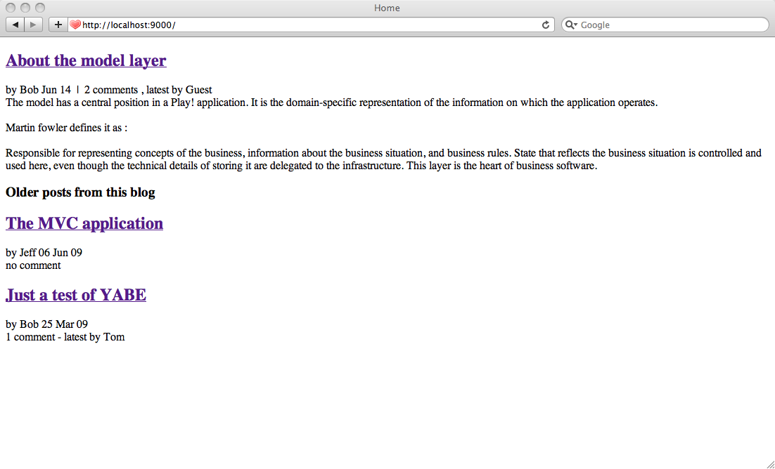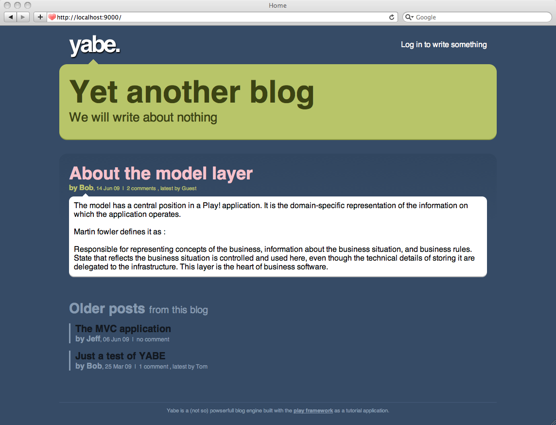 最初の画面がどのようにして表示されるのか覚えていますか? まず最初に、routes ファイルで / という URL が controllers.Application.index() というアクションメソッドを起動するよう指定します。次に、このメソッドが render() を呼び出して /yabe/app/views/Application/index.html テンプレートを実行します。
