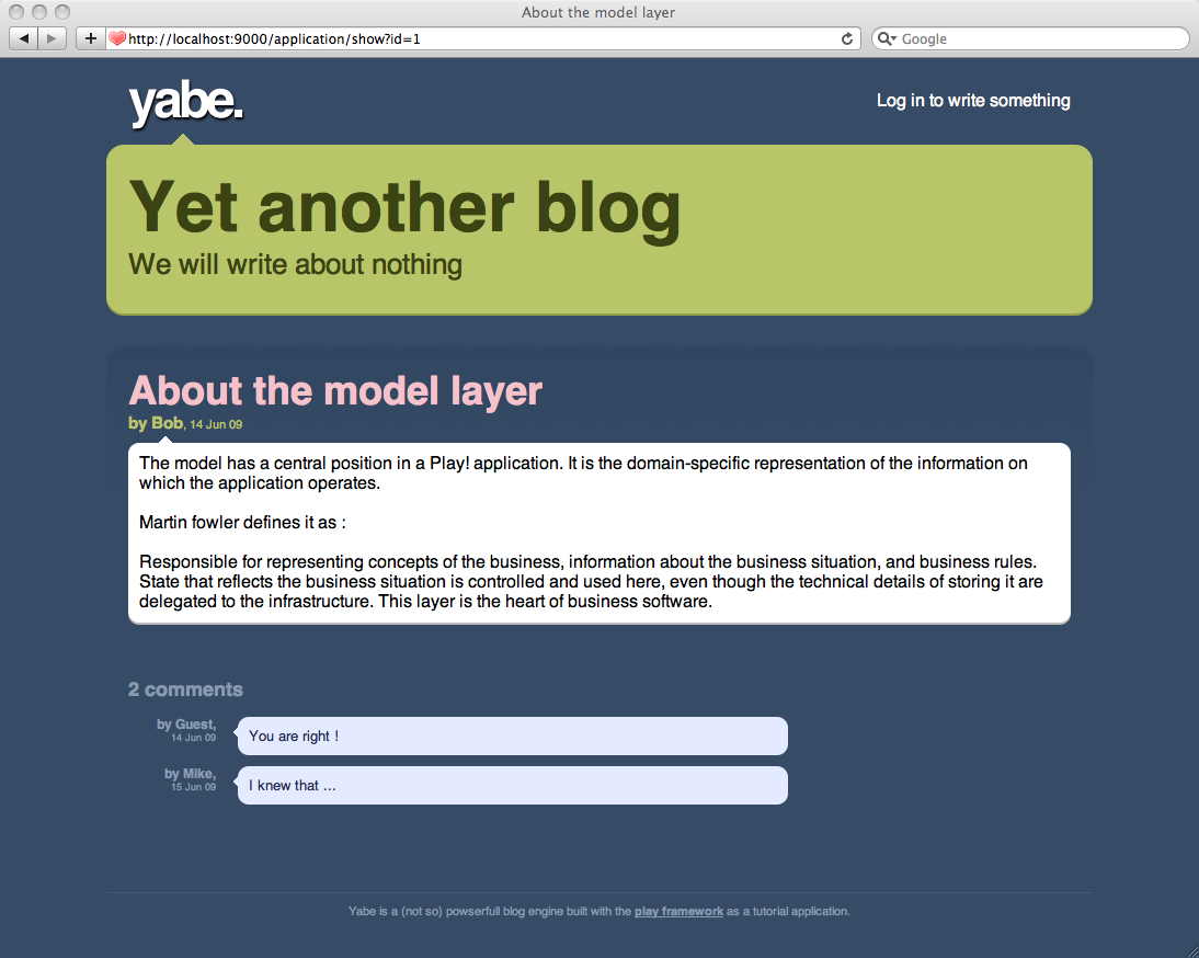 よく出来ていますが、トップページへ戻るためのリンクがありません。 /yabe/app/views/main.html テンプレートを編集して、タイトルへのリンクを完成させます: