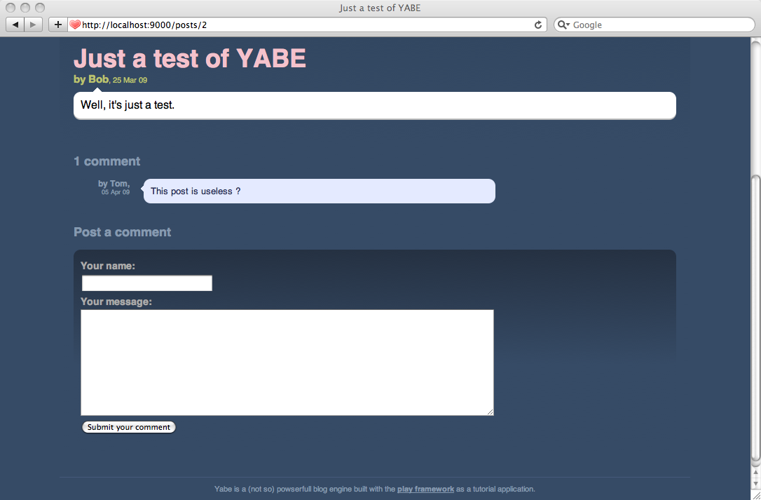 投稿者により親切な UI フィードバックを提供するために、エラーが発生した場合には、自動的にコメントフォームにフォーカスをセットする、ちょっとした JavaScript を追加します。このスクリプトは JQuery と JQuery Tools Expose を補助ライブラリとして使用するので、これらを include する必要があります。これら 2 つのライブラリを /yabe/public/javascripts にダウンロードしたら、これらを include するよう main.html を変更してください: