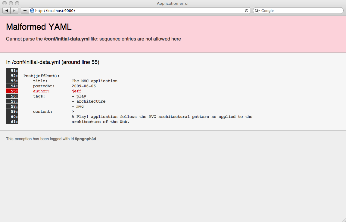 新しい初期データセットを強制的に読み込ませるためにアプリケーションを再起動する必要があります。Play は YAML ファイルにおいてすら、以下のようにして問題を報告することを確認してください: