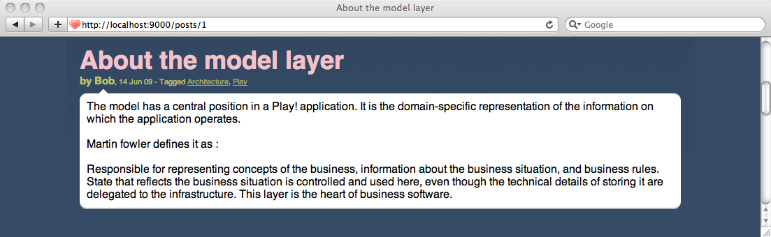 ここまでで、タグによって投稿をリスト表示する新たな方法を追加できるようになりました; #{display /} タグの中に上で空のままにしたリンクを、新しい listTagged アクションへのリンクで置き換えてみましょう: