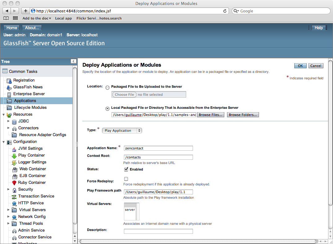 アプリケーションを WAR ファイルにパッケージするわけではないことに注意してください。Glassfish 用の Play コンテナはアプリケーションをネイティブ実行します: Glassfish 用の Play コンテナは Servlet コンテナを使用しませんし、アプリケーションを何か特別な方法でパッケージする必要もありません。