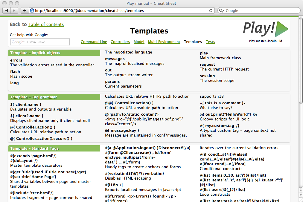 Play のドキュメントに、一般的な Play の関数を素早く参照するためのいくつかのチートシートを含めました。このチートシートは簡単に印刷できます。